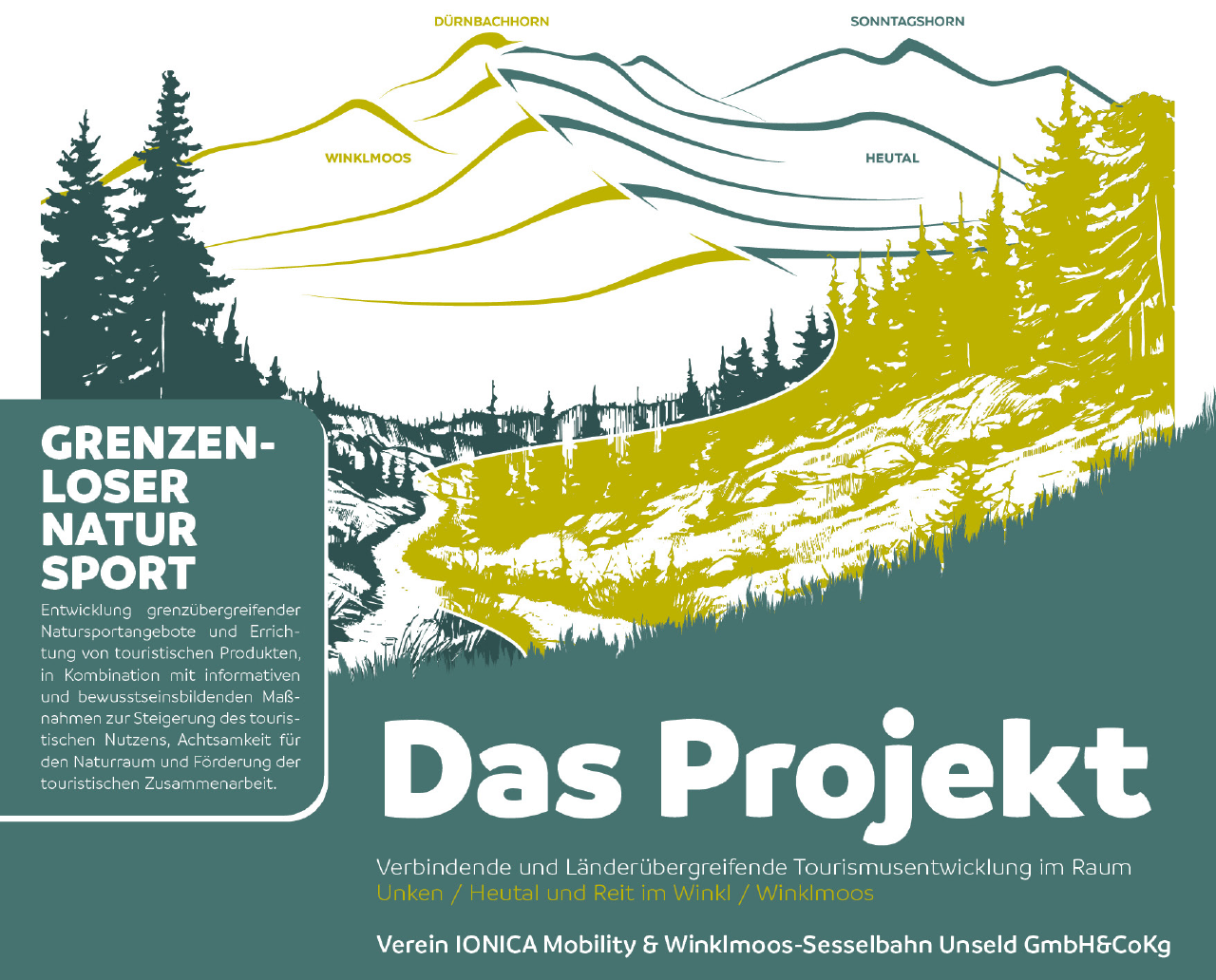 Die gemeinsame Herausforderung der Region Unken/Heutal – Reit im Winkl/Winklmoos ist es, in der Region einen zukunftsfähigen, umweltfreundlichen und innovativen Tourismus weiterzuentwickeln. Das bestehende Angebot wird so weiterentwickelt werden, dass in der Region grenzübergreifende, nachhaltige und verbindende Aktivitäten für Einheimische und Gäste zusätzlich angeboten wird. Mit dieser Weiterentwicklung wird der auf Natur, Familien und sanften Tourismus ausgelegte Tourismus weiter entwickelt und die damit verbundenen Beschäftigten abgesichert . Gleichzeitig wird die Region in Zukunft als grenzüberschreitende gemeinsame Region wahrgenommen. Das Förderprojekt trägt dazu bei, dass mittels einer Anschubfinanzierung Projekte und Produkte entwickelt werden, die über den Projektzeitraum hinaus bestand haben.